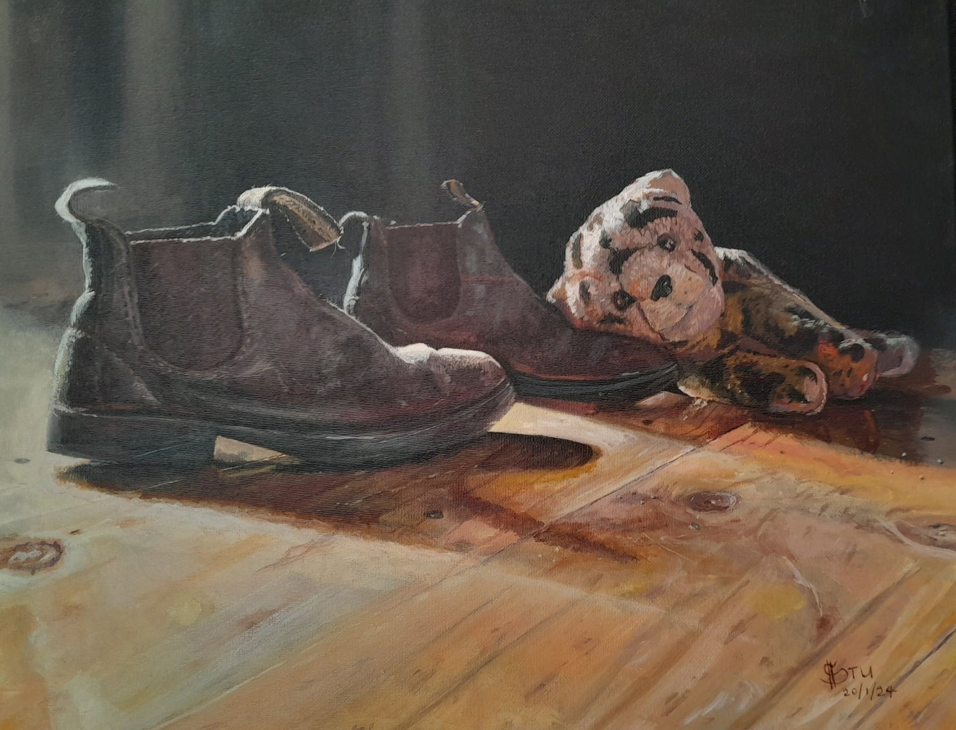 A still life dedicated to my daughter’s screen-used wardrobe and prop that appear in the Stan Original, A Sunburnt Christmas (2020). My daughter played the adorable Daisy Raley in the film and was gifted these Blundstones by the wardrobe department when production wrapped.
